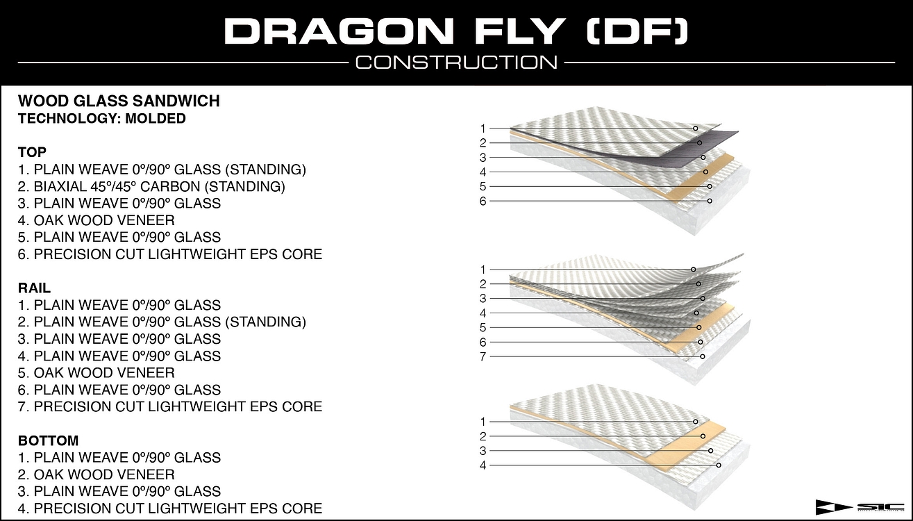 Das Okeanos wird in der Dragon Fly (DF) – Bauweise gefertigt. Diese Konstruktion sorgt im Vergleich zur früheren TWC Bauweise für deutlich mehr Haltbarkeit. Dabei wird der EPS-Kern komplett mit Eichenholzfurnier umwickelt – (Tip-to-Tail / 360-Grad-Rail-to-Rail-Wrap). Damit gehören die Okeanos Boards wohl zu den robustesten Composite Boards auf dem Markt. Zudem überzeugen sie mit einem wettbewerbsfähigen Gewicht und erschwinglichem Preis. Die Boards werden zusätzlich mit Fiberglas laminiert und mit einer einzigartigen Grafik versehen. Das komfortable EVA-Deckpad rundet die Ausstattung ab.